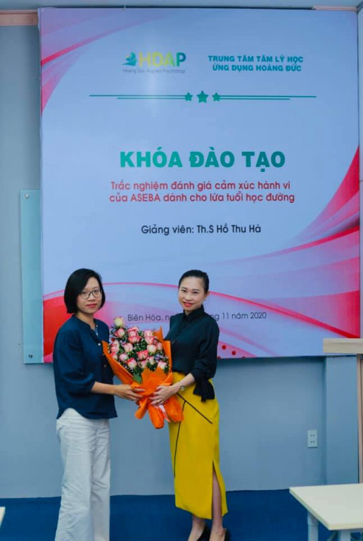 (Hình 1. ThS Bùi Ngọc Diễm, Giám đốc Trung tâm Tâm lý học ứng dụng Hoàng Đức tặng hoa giảng viên)
