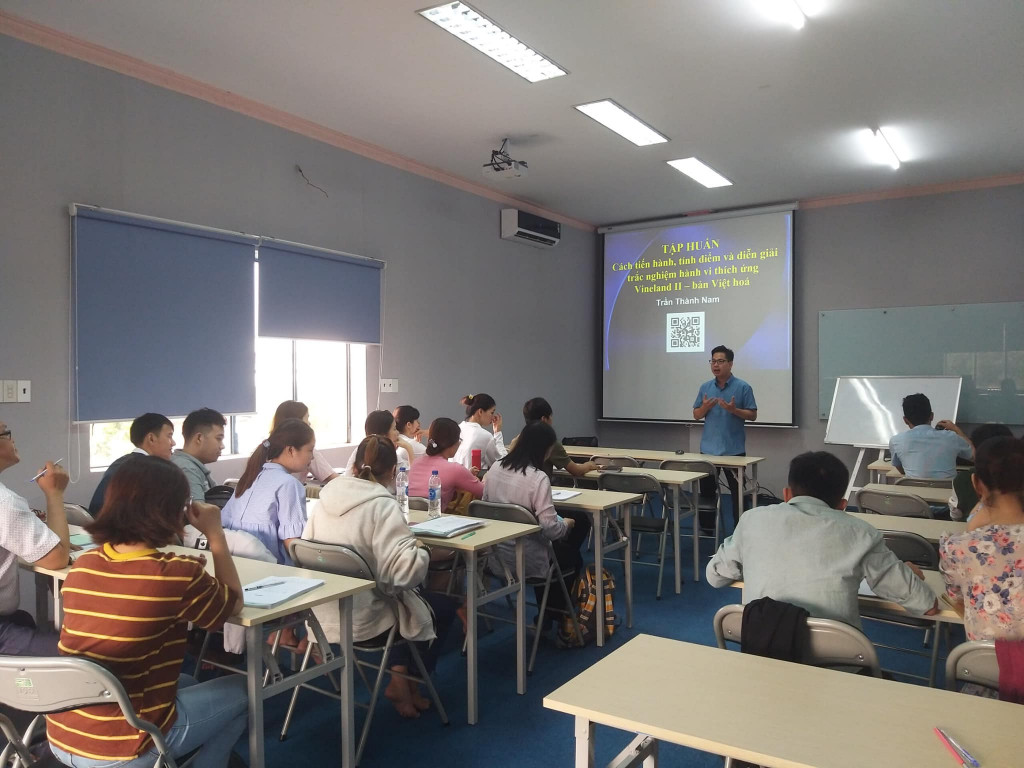 Với thời lượng một ngày tập huấn các học viên đã cùng PGS Trần Thành Nam tìm hiểu sơ lược về khái niệm hành vi thích ứng, lược sử, tổng quan các phiên bản của Vineland-II và hướng dẫn cách diễn giải, tính điểm mẫu phỏng vấn phổ điểm. Đồng thời, các học viên cũng được PGS TS Trần Thành Nam hướng dẫn thực hành thực hiện thang đo, diễn giải và phản hồi kết quả, viết báo cáo giải trình.