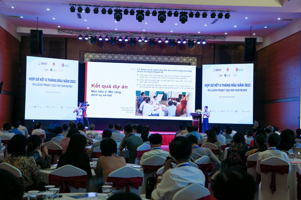 [HDAP] Trong hai ngày 04 & 05/8/2022, tại thành Phố Hội An thuộc tỉnh Quảng Nam, Dự án “Hỗ trợ cải thiện chất lượng sống của người khuyết tật tại các tỉnh bị phun rải nặng chất da cam” (Hoà nhập/ INCLUSION) đã tổ chức hội nghị sơ kết 6 tháng đầu năm và chia sẻ kinh nghiệm. Đây là dự án kéo dài 5 năm (2021 - 2026) tại 8 tỉnh (Quảng Trị, Thừa Thiên Huế, Quảng Nam, Bình Định, Kon-Tum, Tây Ninh, Bình Phước và Đồng Nai) do Cơ quan Phát triển Quốc tế Hoa Kỳ (USAID) tài trợ và Trung tâm hành động quốc gia khắc phục hậu quả chất độc hóa học và môi trường (NACCET) là Chủ dự án, các nhà thầu chính là Trung tâm Hỗ trợ Sáng kiến Phục vụ Cộng đồng (CSIP), Trung tâm Sáng kiến Sức khỏe và Dân số, và Trung tâm Nghiên cứu Phát triển Y tế cộng đồng. Hoàng Đức là một trong các nhà thầu phụ triển khai gói thầu “Can thiệp và hỡ trợ tâm lý cho người khuyết tật và người thân của họ tại Tây Ninh, Bình Phước và Đồng Nai”.