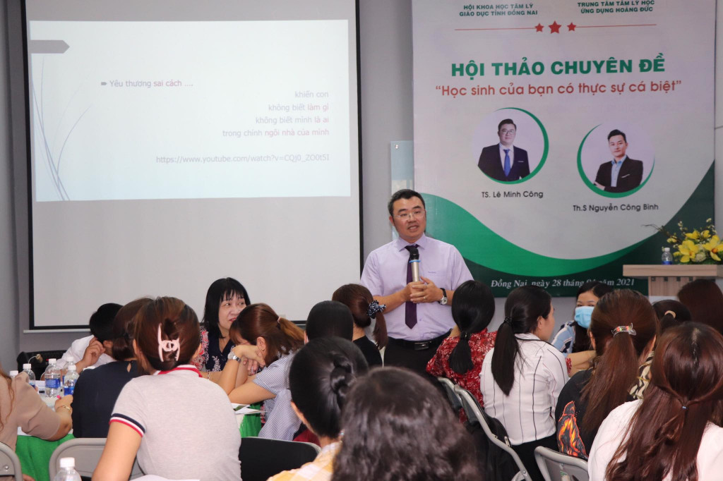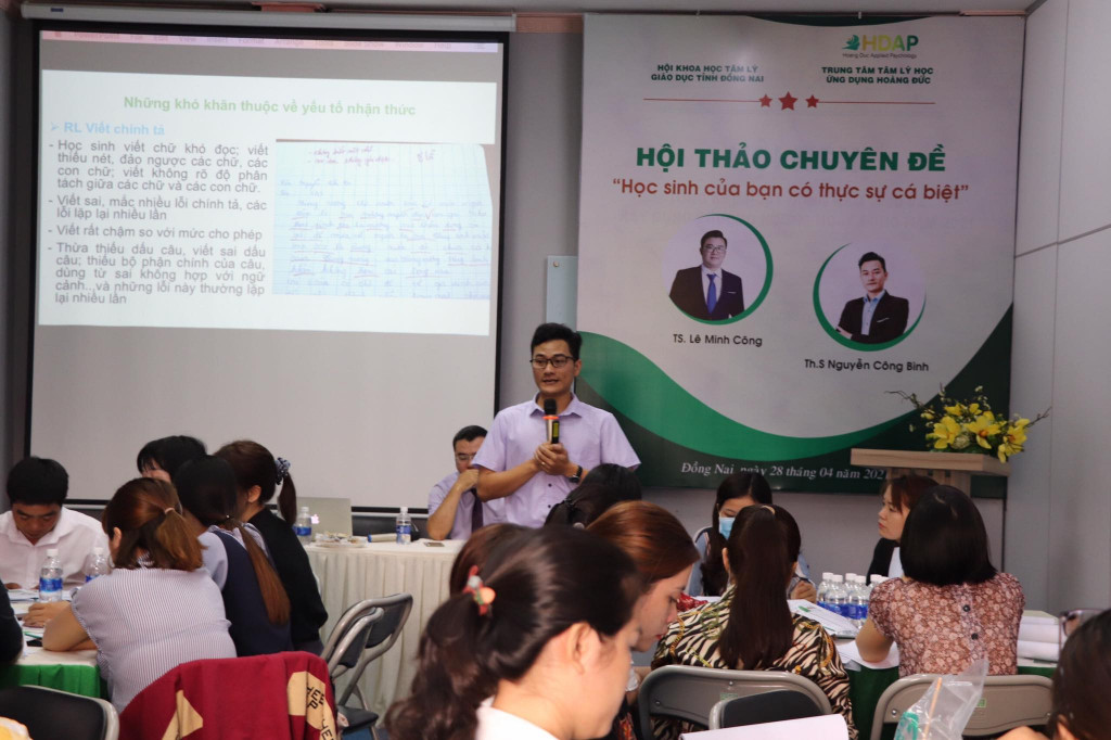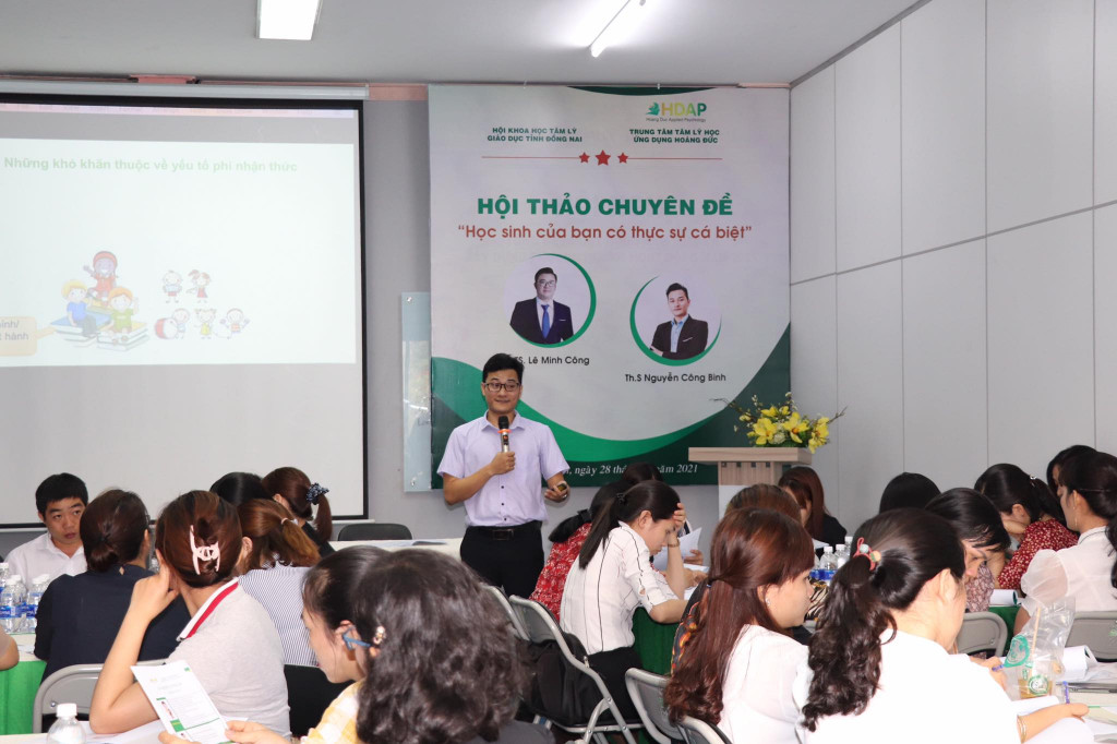 [HDAP] Sáng ngày 28/4/2021, tại Biên Hoà, Trung tâm Tâm lý học ứng dụng Hoàng Đức và Hội Khoa học Tâm lý – Giáo dục tỉnh Đồng Nai đã tổ chức buổi hội thảo chuyên đề “Học sinh của bạn có thực sự cá biệt?”. Hội thảo có sự tham dự của hơn 40 giáo viên tại các trường Tiểu học, THCS trên địa bàn tỉnh Đồng Nai và các nhà tâm lý đến từ TP Hồ Chí Minh và Biên Hoà.