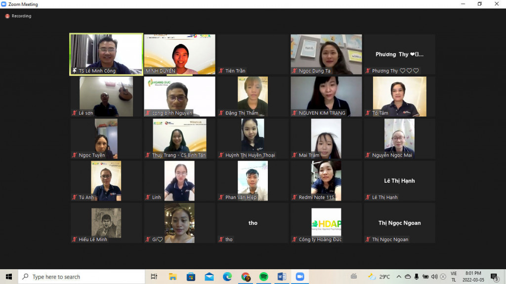 Webinar đã có sự tham gia của: TS Lê Minh Công - Giám Đốc Trung tâm nghiên cứu và Hỗ trợ sức khỏe tinh thần, trường ĐH KHXHNV ĐHQG-TP.HCM, ThS. Nguyễn Công Bình – GĐ Trung tâm Tâm lý học ứng dụng Hoàng Đức, bà Tạ Ngọc Dung - GĐ hệ thống trường mầm non EDC ACADEMY TP.HCM, cùng hơn 40 giáo viên của Hệ thống Trung tâm trẻ tự kỷ Hoàng Đức và hệ thống trường mầm non EDC ACADEMY TP.HCM.